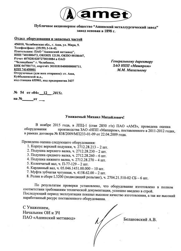 Также отмечена высокая надежность оборудования, что подтверждается очередным отзывом в адрес ЗАО «НПП «Машпром».